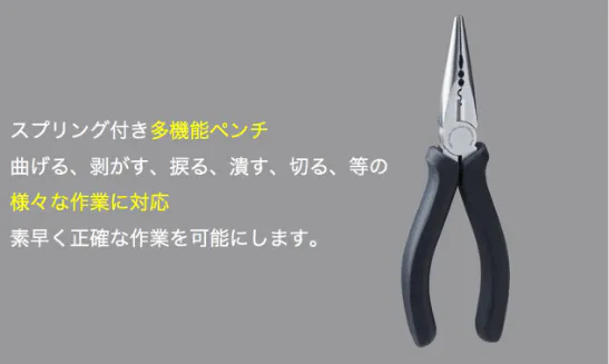 HOTO SETの多機能ペンチは「曲げる、剥がす、捩る、潰す、切る」等の様々な作業に対応したスプリング付き多機能ペンチです。