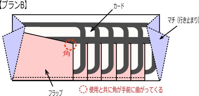 次に思い付いたのが、図【プランB】のようにカードの枚数分のフラップで、カードを挟み込むタイプのものです。最初これは非常に良いと思い製品サンプルまで製作しましたが、使っているうちにフラップの角部分が手前の方に浮いてくる現象が起こりました。これは、角を丸めても同じでした。