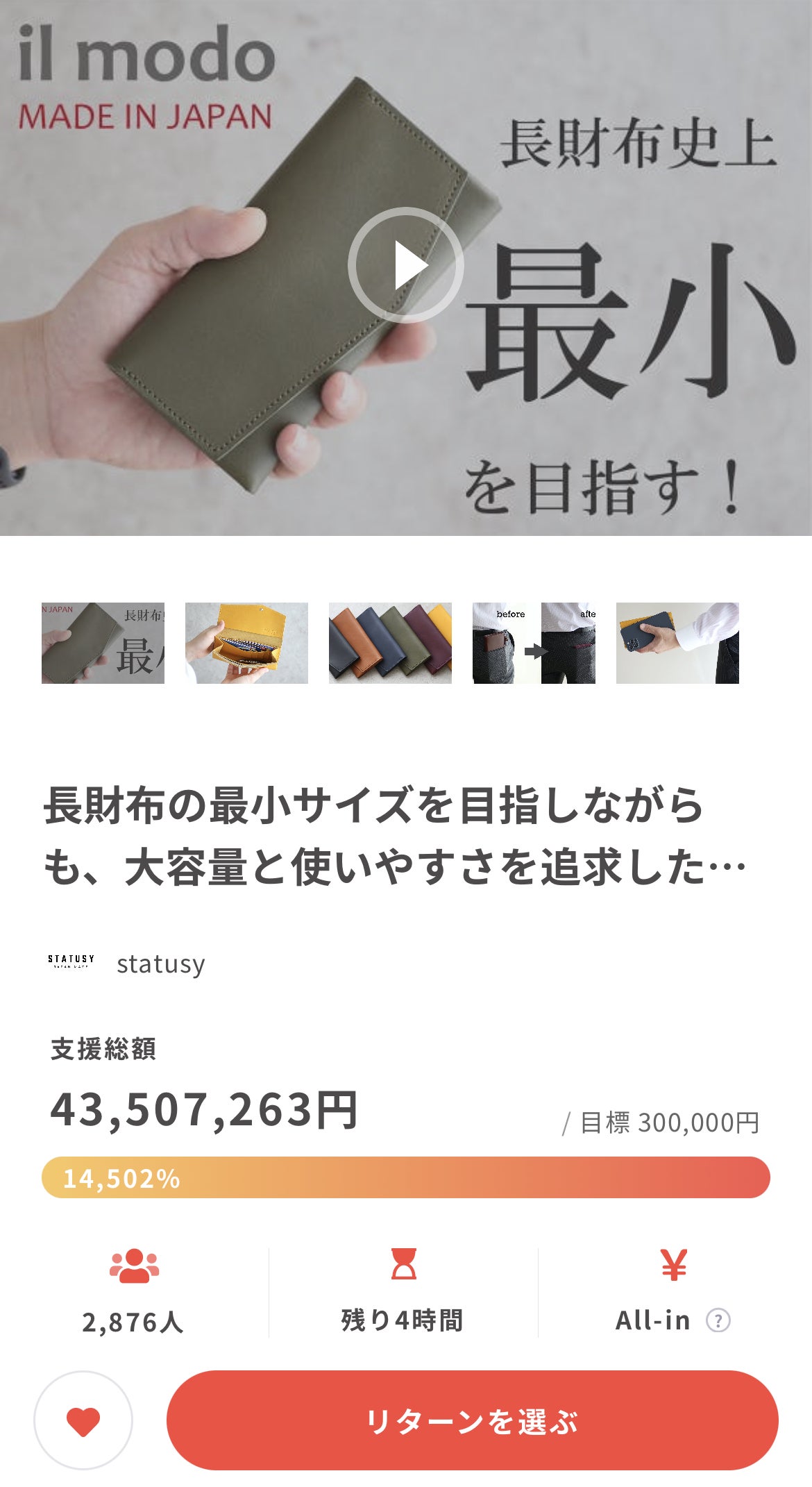 2025/03/04 16:34中身を収納しても「最薄」「最小」を目指した長財布「il modo Air」のページが公開開始となりました!↓ ↓ ↓https://www.makuake.com/project/ilmodo-air/「通知を受け取る」ボタンを押して登録しておけば、当日に通知を受け取ることが出来きます。当日はこのページからご購入いただけます。「il modo Air」の詳しい内容はこちらです。↓ ↓ ↓https://statusy.jp/pages/ilmodoair国内外のクラウドファンディングで累計2億3000万円以上の支援を受け、国内クラファンの財布歴代最高額を達成した「il modo ZIP」から3年、ようやく薄さを極めた新作長財布が誕生しました!この開発までの長いストーリーも上のリンクから見ていただけますので、是非ともご覧くださいませ。3年がかりで完成した自信作ですので、お楽しみに。 もっと見る