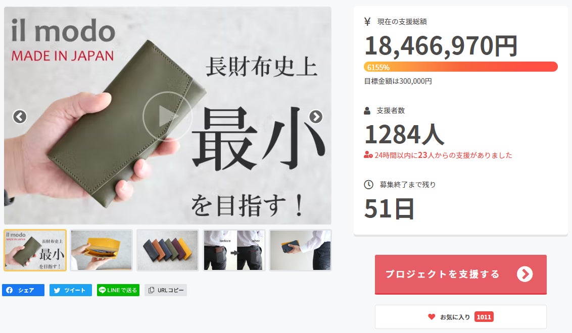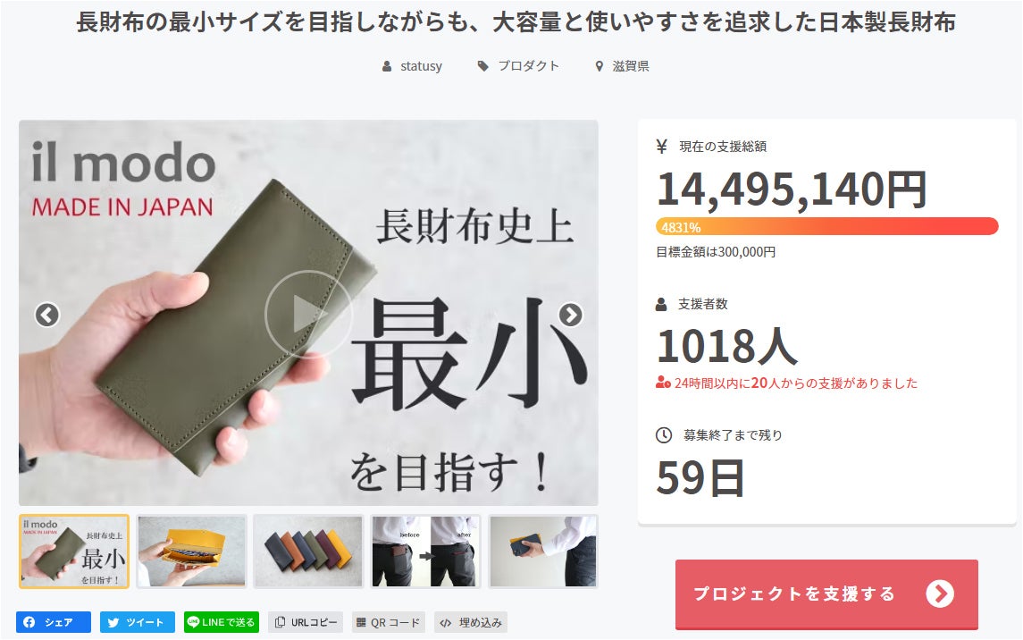 おかげさまで大好評!!長財布最小を目指した「il modo(イルモード)」募集終了まで残り5日となりました!https://camp-fire.jp/projects/view/599963?list=new_key_visual現在、20%OFFのリターンがのこり50個を切りました!また、プロジェクト終了後は一般販売価格19,800円(税込)となりますのでご検討中の方は是非お早めにお求めくださいませ!弊社はクラウドファンディングで得た資金をブランドの成長、認知へ向けての費用にしっかりと充てさせていただきます!ブランド立ち上げ時の目標であったメイドインジャパンブランドを世界のステータスへ!を叶えるため、これからも走り続けます!引き続き応援のほどどうぞよろしくお願いいたします。ステータシー株式会社 代表田中比呂達