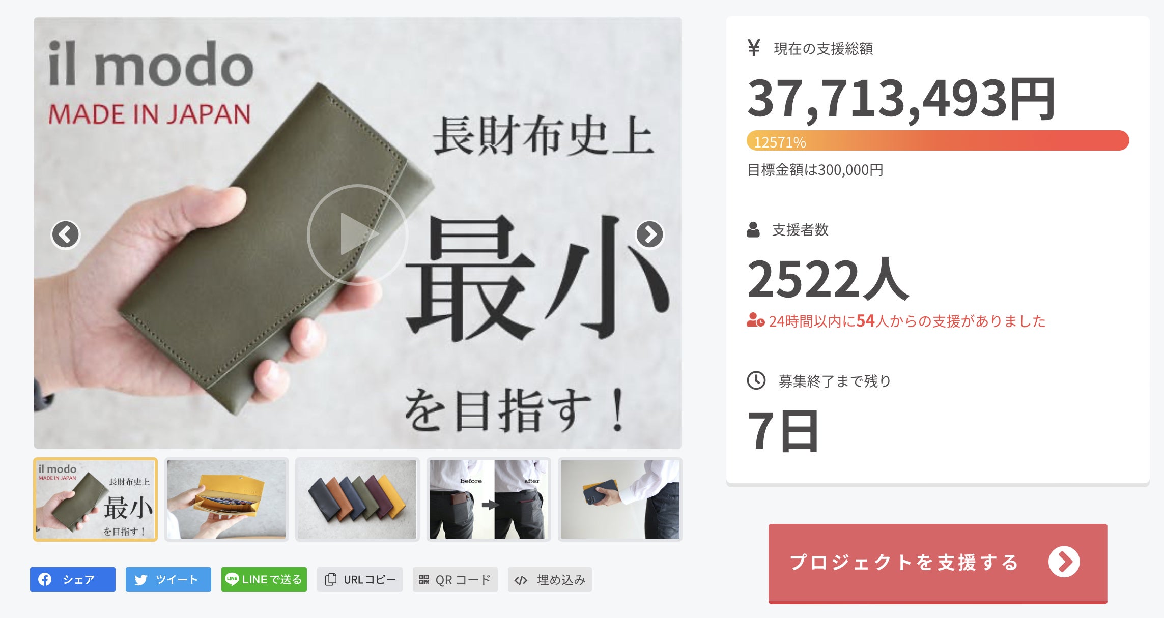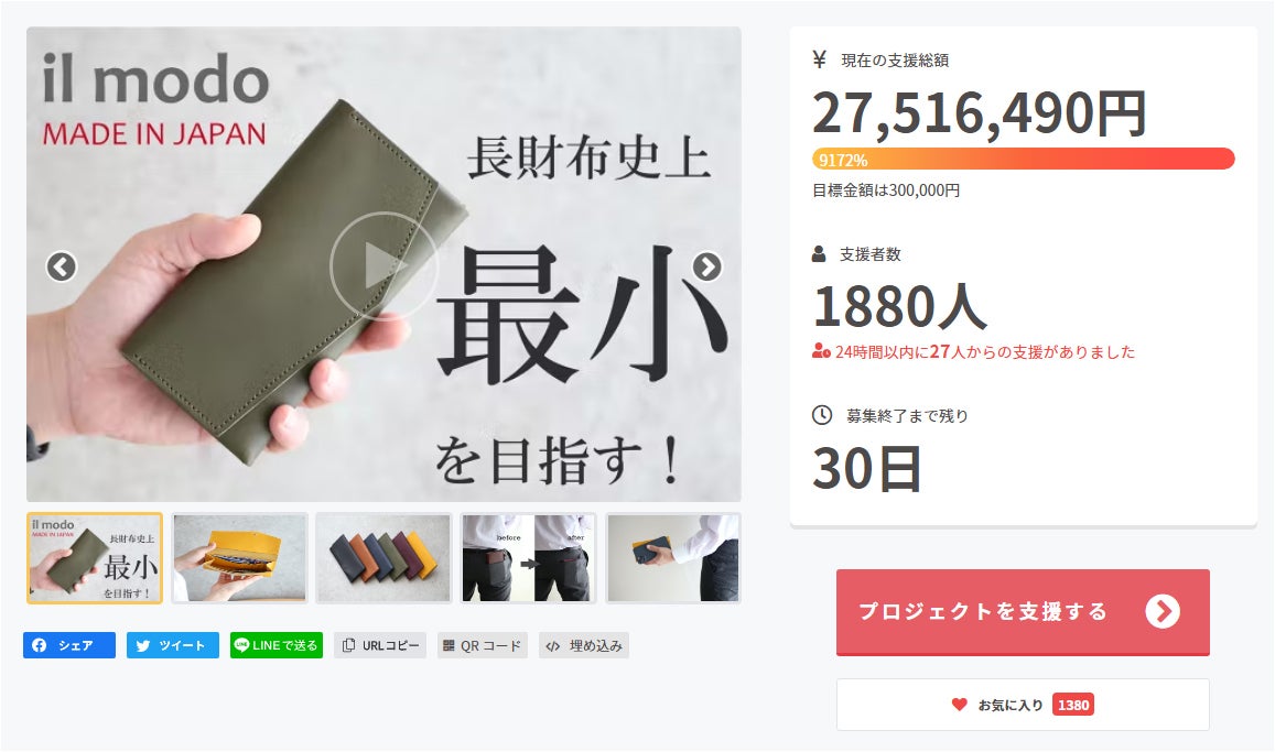 長財布史上最小を目指しながらも大容量で使いやすい日本製長財布「il modo (イルモード)」プロジェクト期間残り30日となりました!現在、2,750万円以上のとてつもないご支援を頂き、目標の9170%を達成しております!多くのご支援に心から感謝申し上げるとともに、この多くのご期待に応えるためにも高品質な製品を期間内に収めるのは勿論、今後STATUSY(ステータシー)というブランドを世界へと認知してもらうために様々な挑戦を続けてまいります!のこり30日、まだまだ募集中です!引き続きどうぞよろしくお願いいたします。ステータシー株式会社 代表 田中比呂達https://camp-fire.jp/projects/view/599963