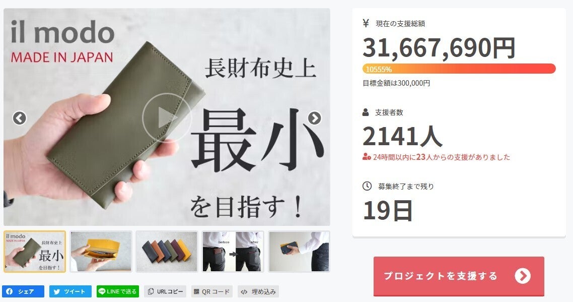 ステータシーのプロジェクト「長財布史上最少を目指す『il modo (イルモード)』」プロジェクト終了まで19日となりました!現在、支援額31,667,690円、目標の10555%達成中です!https://camp-fire.jp/projects/view/599963正直、ここまでご支援いただけるとは本当に想像以上です!!ご支援くださった皆様に心より感謝申し上げるとともに、ステータシーというブランドを世界に広めるためにも今後更なる努力をしてまいります!残り19日、まだまだ募集中であります!今回のプロジェクトが終了後は一般販売価格19,800円となります。最後のお得な機会を是非お見逃しなくお願いいたします!ステータシー株式会社代表 田中比呂達