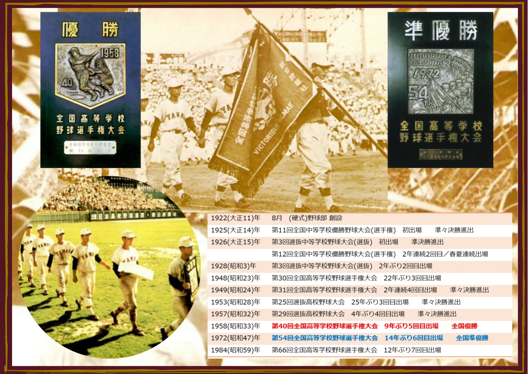 山口県立柳井高等学校硬式野球部は、1922(大正11)年8月に創部し、以来1958(昭和33)年に第40回全国高等学校野球選手権大会で優勝、1972(昭和47)年に第54回全国高等学校野球選手権大会で準優勝を含む、春4回・夏7回の計11回の甲子園出場を果たし、2022(令和4)年8月に創部100周年を迎えます。