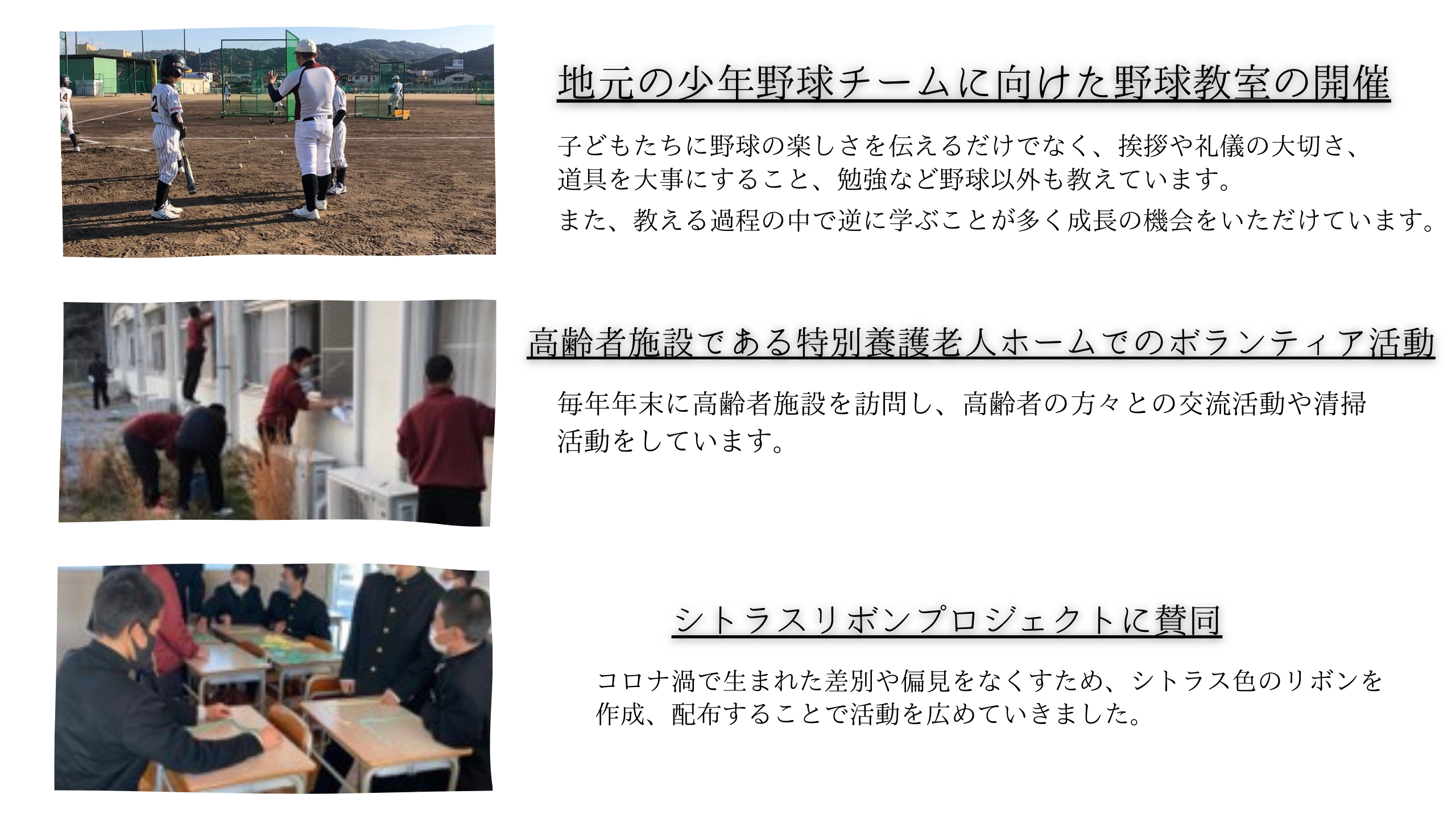 また、野球ができる環境に感謝の意を込めてオフシーズンを中心に、地域貢献活動(ボランティア活動)に積極的に取り組んでいます。