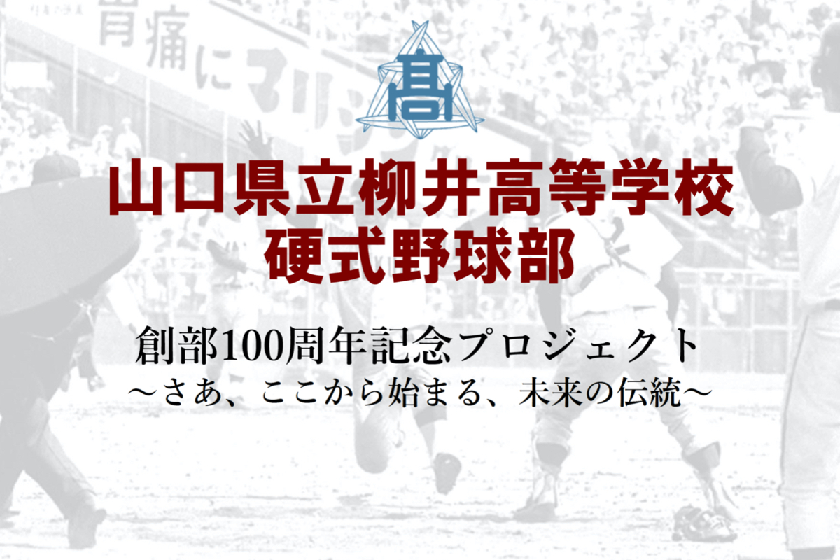 私共は本年、柳井高校硬式野球部OB会琴陽倶楽部が中心となり、柳井高校硬式野球部とともに創部100周年を盛大に盛り上げるべく、様々な記念事業を企画しております。最高の記念事業を作り上げるには、柳高OB、全国の高校野球ファン、地域の皆様と、今こそ一体となって新しい未来へスタートしたいという想いから、この度のクラウドファンディングにチャレンジさせていただく運びとなりました。
