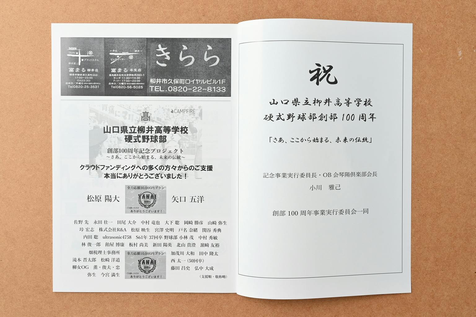 2022/11/16 21:07「柳井高校硬式野球部創部100周年記念プロジェクト」 プロジェクトオーナーの山口県立柳井高等学校硬式野球部OB会 琴陽倶楽部です。この度、11月20日(日)の10時からビジコム柳井スタジアムで開催されます柳井高校創部100周年 記念親善試合「柳井 vs 津久見」のパンフレットが完成しました。こちらの特設ページに、「全力応援10,000円プラン」「全力応援30,000円プラン 」 にご支援いただきました皆様のお名前を掲載させていただきました。改めまして、御礼申し上げます。なお、こちらの記念パンフレットをご希望の方がいらっしゃいましたら無料で配布させていただきますので、氏名、住所、連絡を記入の上、メッセージをお送りください。今後とも山口県立柳井高等学校硬式野球部の応援、どうぞ宜しくお願い致します。 もっと見る