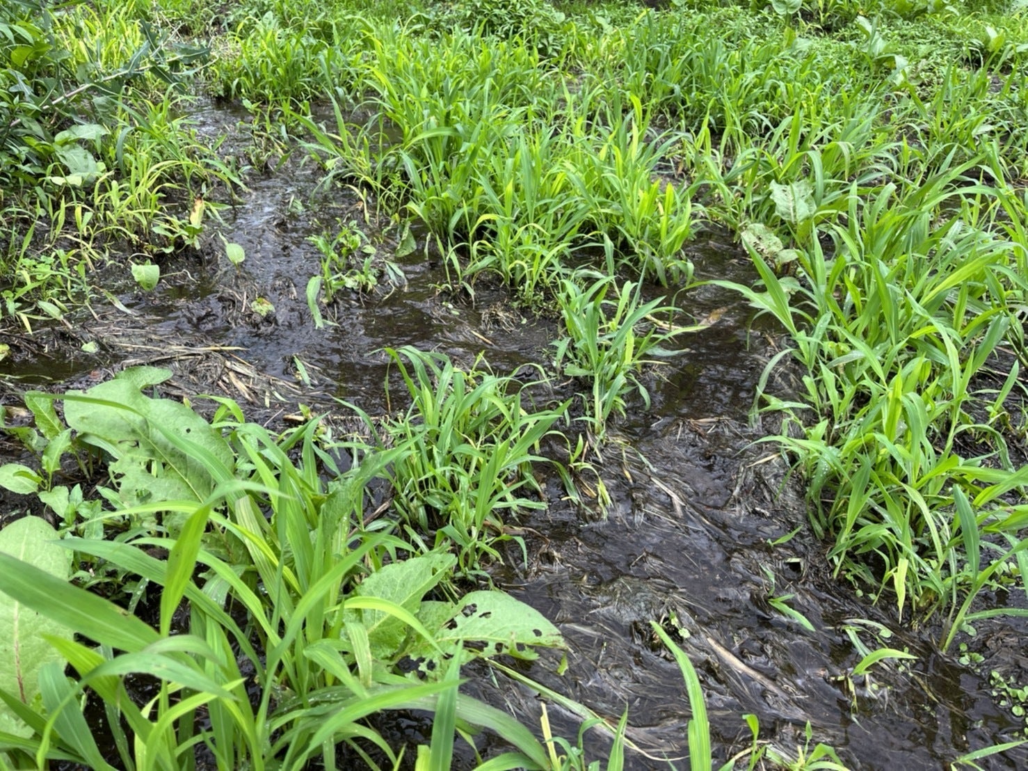 園地内は雨が止んだ後も川のように水が流れています。畑全体が非常にぬかるんでいるため、しばらくは作業機械の侵入が困難です。