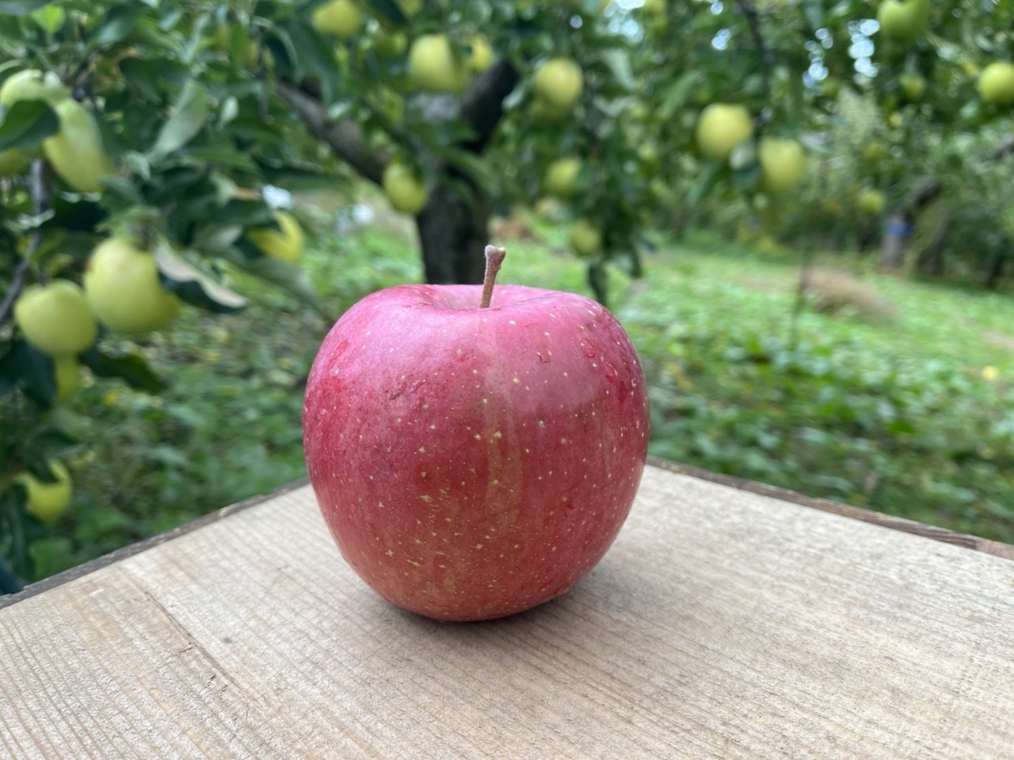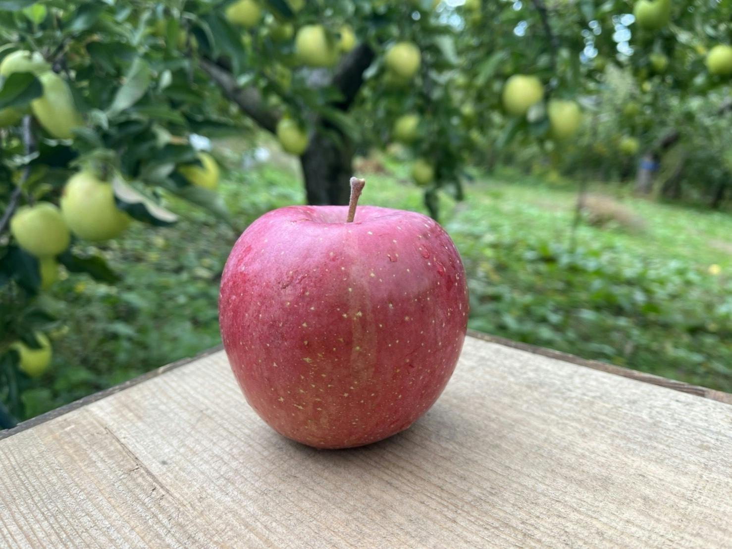 1本の木から沢山のりんごが収穫できるように見えますが、実はこれは春頃に選定した結果で、何も作業しなければこの5倍ほどの実がなります。しかし、その場合は1つ1つのりんごはとても小さくなってしまい商品になりません。大きくて甘いりんごに育てるために選定や手入れを施し、1年かけて選りすぐりの実になったものを出荷しています。皆さんにお届けするりんごも、そんな選りすぐりの1個になります。楽しみにお待ちください!