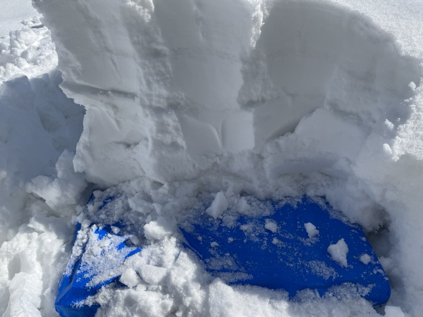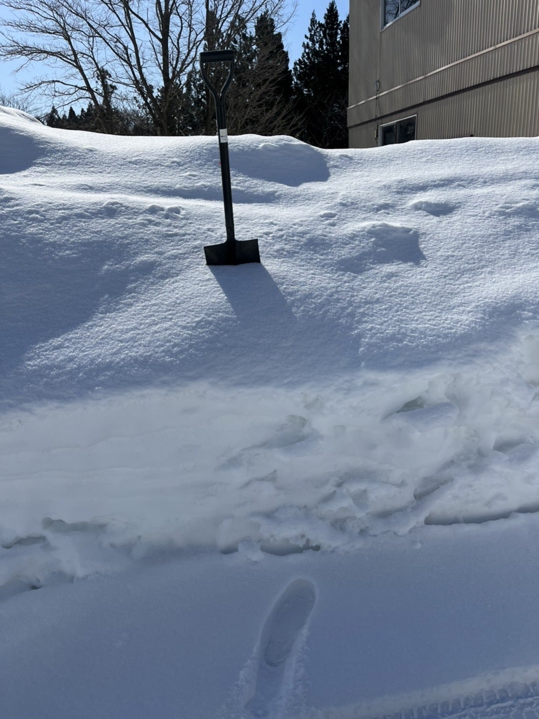 固くなった雪を掻き出し、りんごを野生動物の食害から保護するためのブルーシートまでおよそ1.5メートルを掘りました。