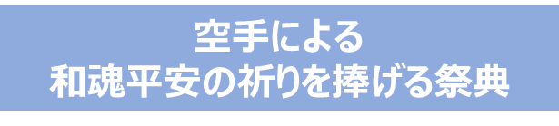 空手は祈り(信仰)に通じ、祈りは誠の道を開き、和魂平安へと導くもの。                                             人は世の為人の為に尽くすべき使命を持って、この世に生まれてきます。正しき道(使命)に進めるよう力をいただき、使命に尽くさせてくださったことに感謝を捧げる祈り(信仰)は、誠の道を開いていきます。