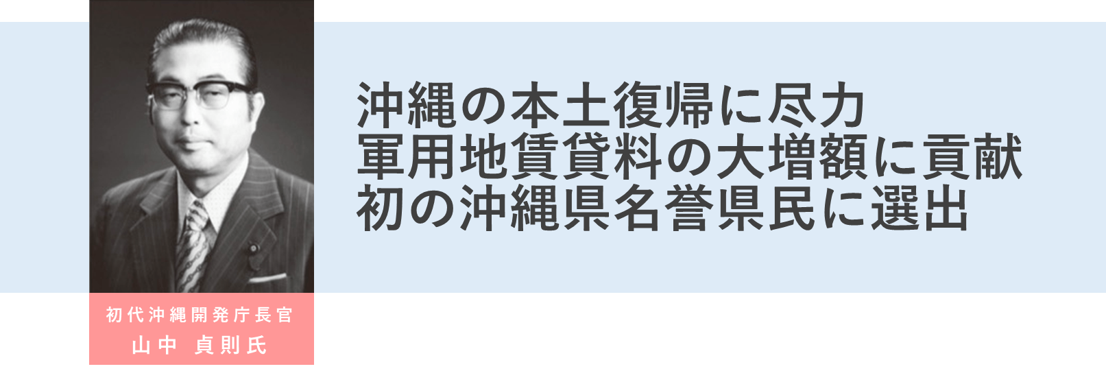 山中貞則氏は鹿児島県曽於市末吉町深川に1921年7月9日に出生。長じて台湾台北第2師範を卒業。大陸へ出征し1946年復員。「高潔で豪胆信念の人」で知られ国政に進出し、戦後、日本の税制改革を率先し垂範した。税制のスペシャリストとして、沖縄復帰、沖縄振興特別措置法、畜産振興など終始一貫し、沖縄問題に心血を注ぎ尽力した。山中貞則は「島津の琉球侵攻を心からお詫びし、政治家としてその贖罪を償う」と宣言しました。「沖縄愛に満ちて慈愛に溢れた人」と称され、沖縄県広域を「島から島へ精力的に飛び回り」課題解決を果たし、沖縄名誉県民第一号 名誉市町村民など多数受賞。「情熱と行動」「反骨精神」を貫き生誕から100年の時が流れる。