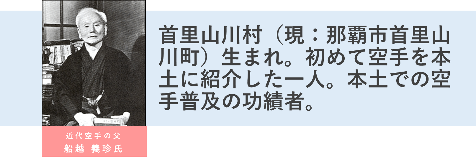 1922年54歳の時、東京の「第一回運動体育展覧会」で首里手をルーツとする唐手 (トーディ) を披露し、その名は日本中を席巻した。88歳の生涯で空手を体系化・理論化し、心技体を充足し「近代空手道」を伝播した。その功績は沖縄県をルーツとし今や世界187ヶ国に一億人以上の空手愛好家が広がり勢いは停まるところを知らない。