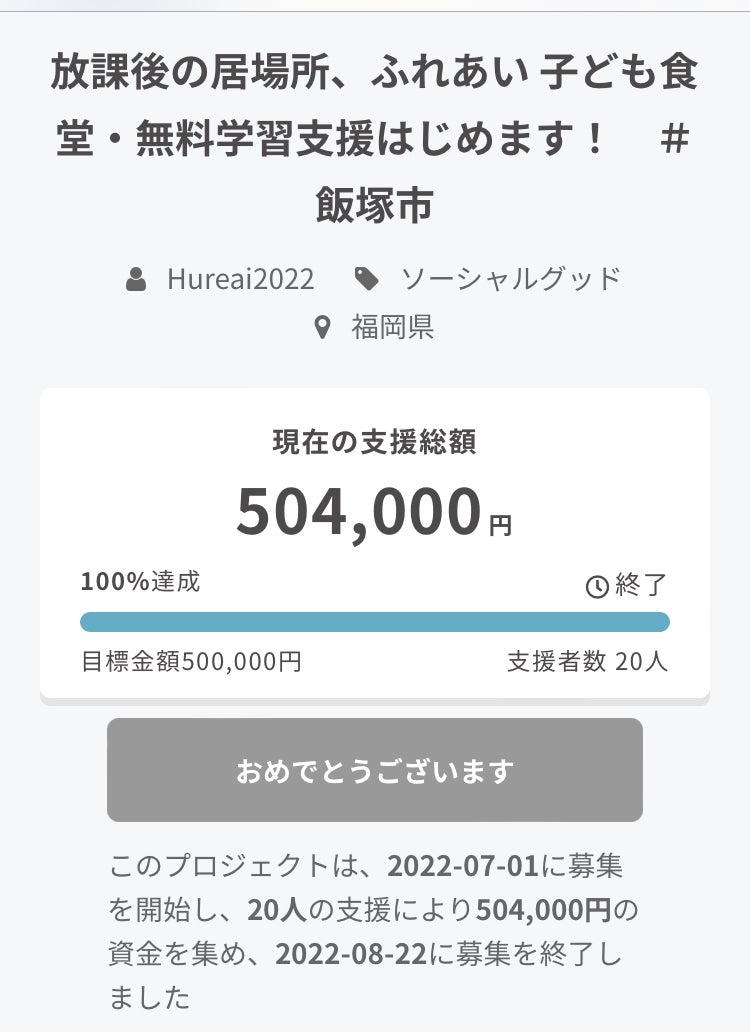 2022/08/23 06:08ありがとうございました!皆様おはようございます!特定非営利活動法人ふれあいです。クラウドファンディング終了しました!これまで応援して頂いた方やご支援頂いた方のお陰で目標金額を達成する事が出来ました。本当にありがとうございました!そして、スタッフの皆さんもありがとうございます。これからも子ども達の居場所作りの為にスタッフ一同奮闘していきます。 もっと見る