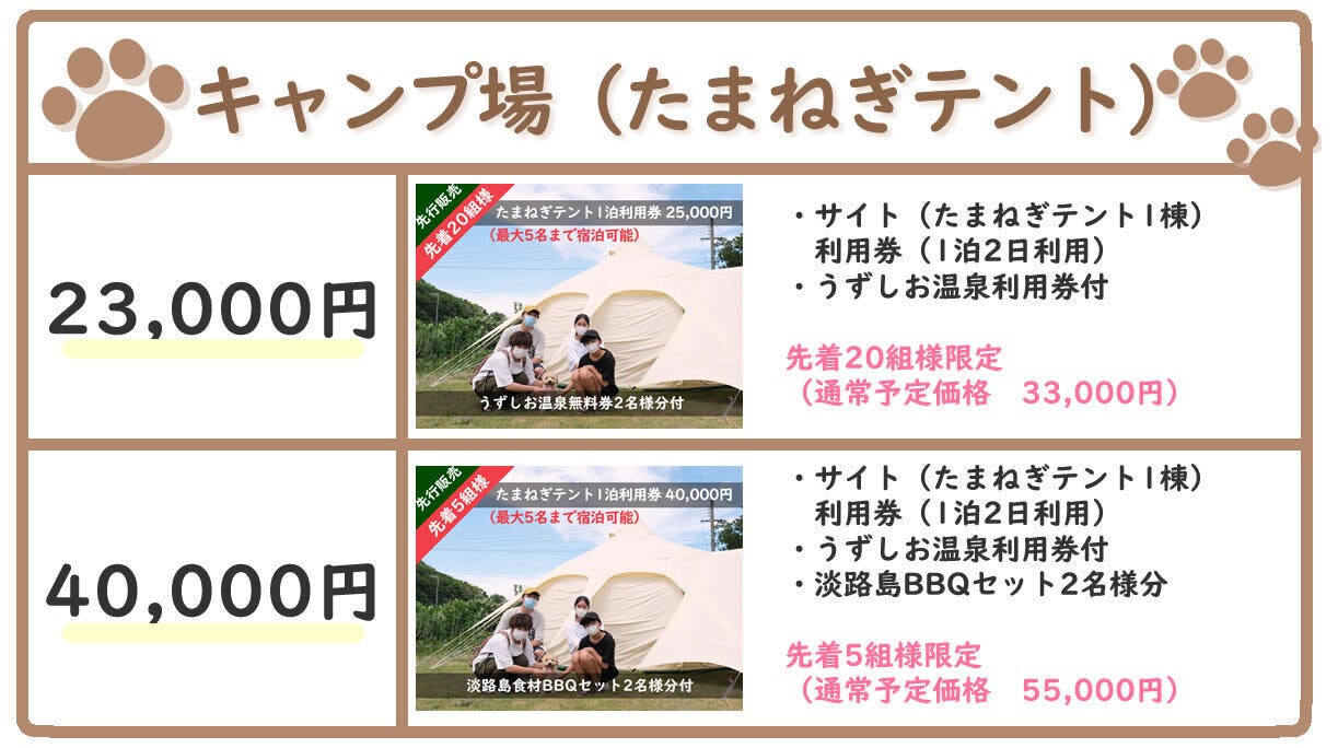 ワンともキャンプ場のたまねぎテントの1棟貸切利用券が先着数限定割引価格でご提供いたします。ご支援後クーポンコードをメールにてお送りします。テントの中は寝具がございませんので寝袋などご用意お願いします。
