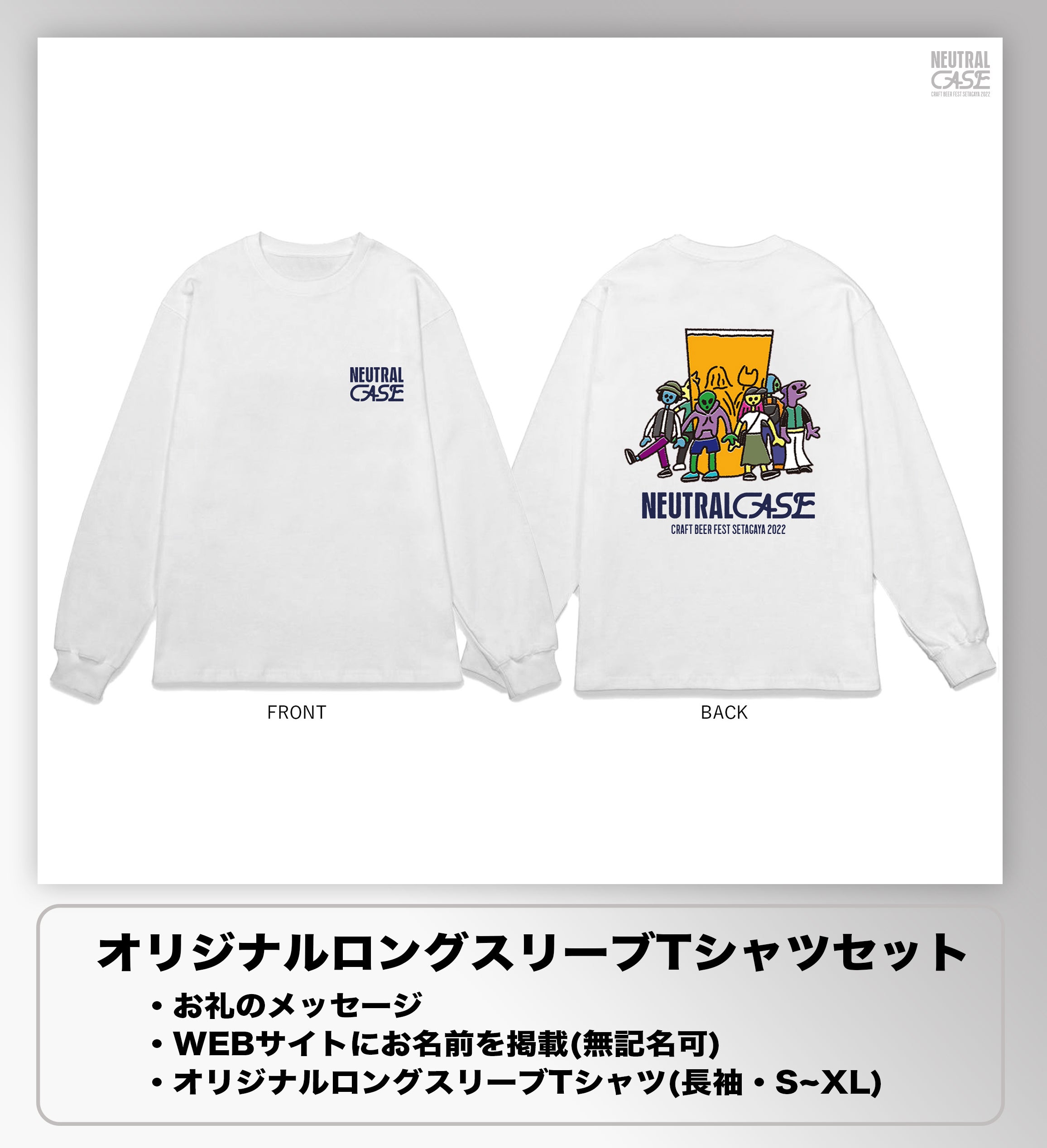 NEUTRAL CASEのロゴとメインイラストをあしらったクラウドファンディング限定オリジナルロングスリーブTシャツです。背面のメインイラストの下に出店ブルワリー・インポーターのロゴが入る特別仕様となります(ロゴ入りver)は後日掲載予定。