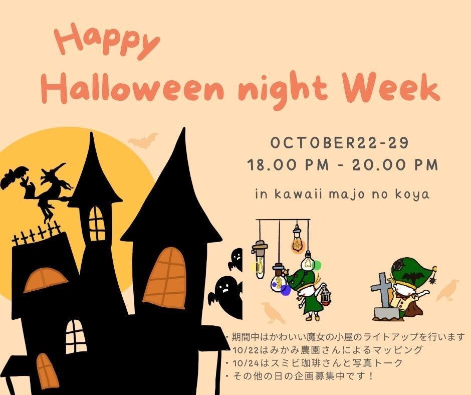 10月22日〜29日まで18時〜20時を目処にかわいい魔女の小屋をライトアップします。そんなにピカピカではなくて、穏やかに夜を過ごしてもらえたらいいなーという感じです。