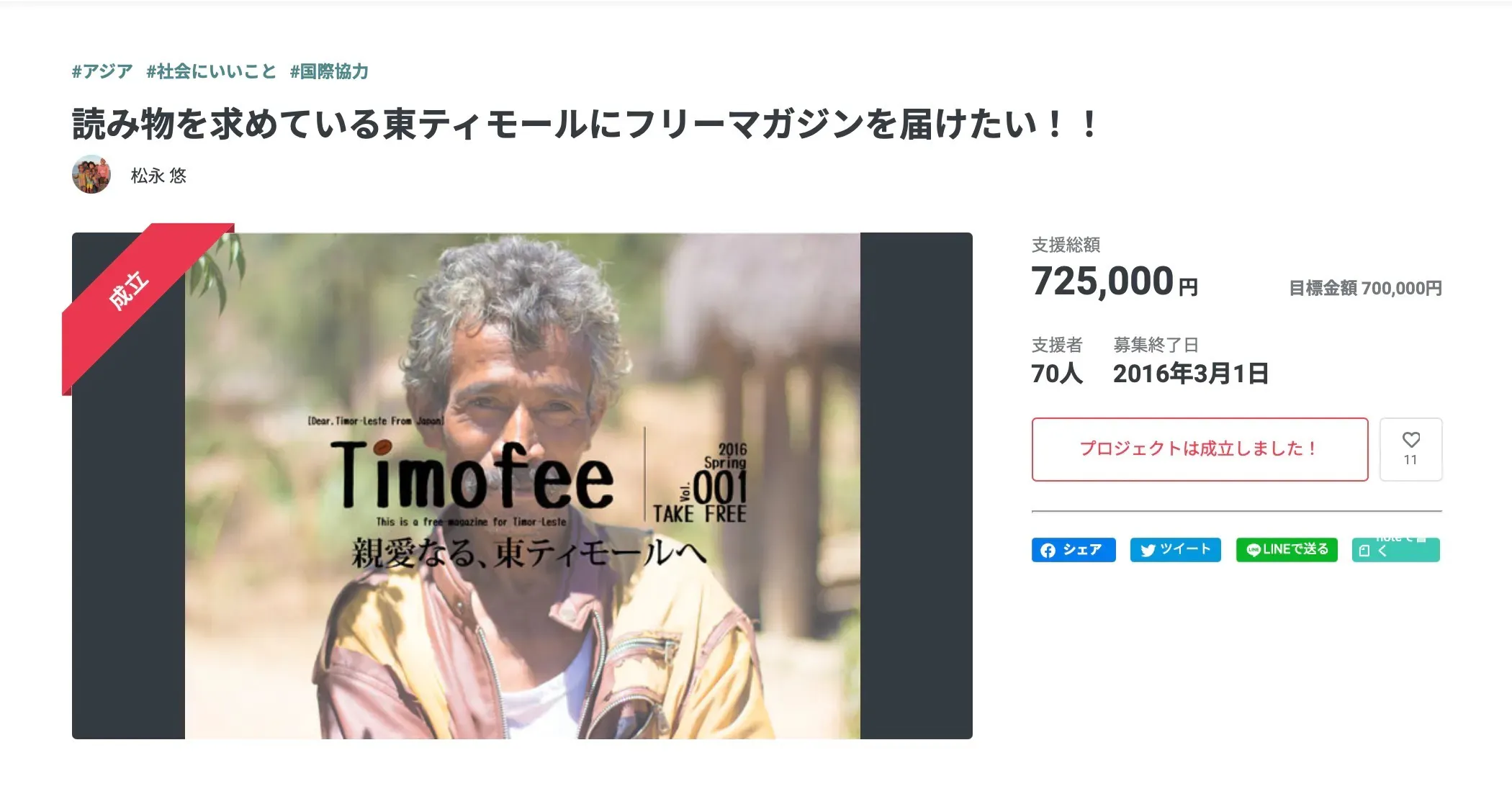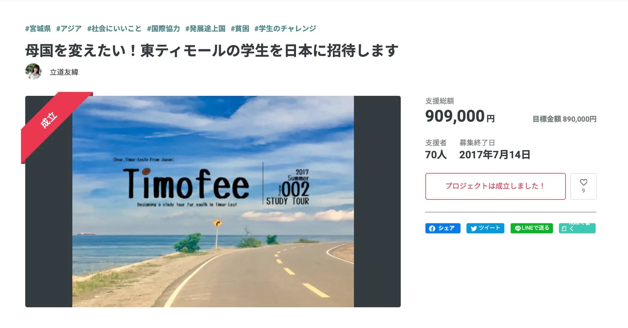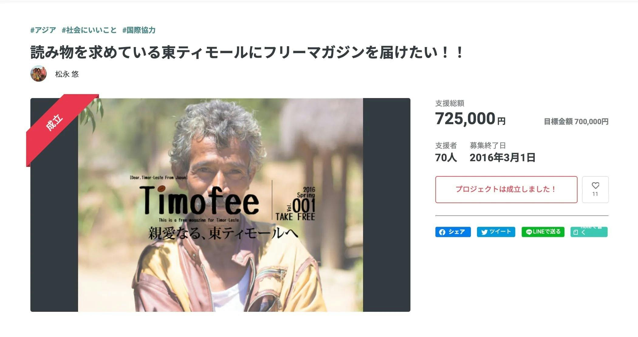 Timofeeプロジェクトは、2016年に行ったクラウドファンディングで725,000円、2017年に行ったそれでは909,000円の支援機を頂き、東ティモールの留学生を宮城県、女川町へ誘致したり、日本語・英語・テトゥン語による雑誌の発刊を行ってきました。