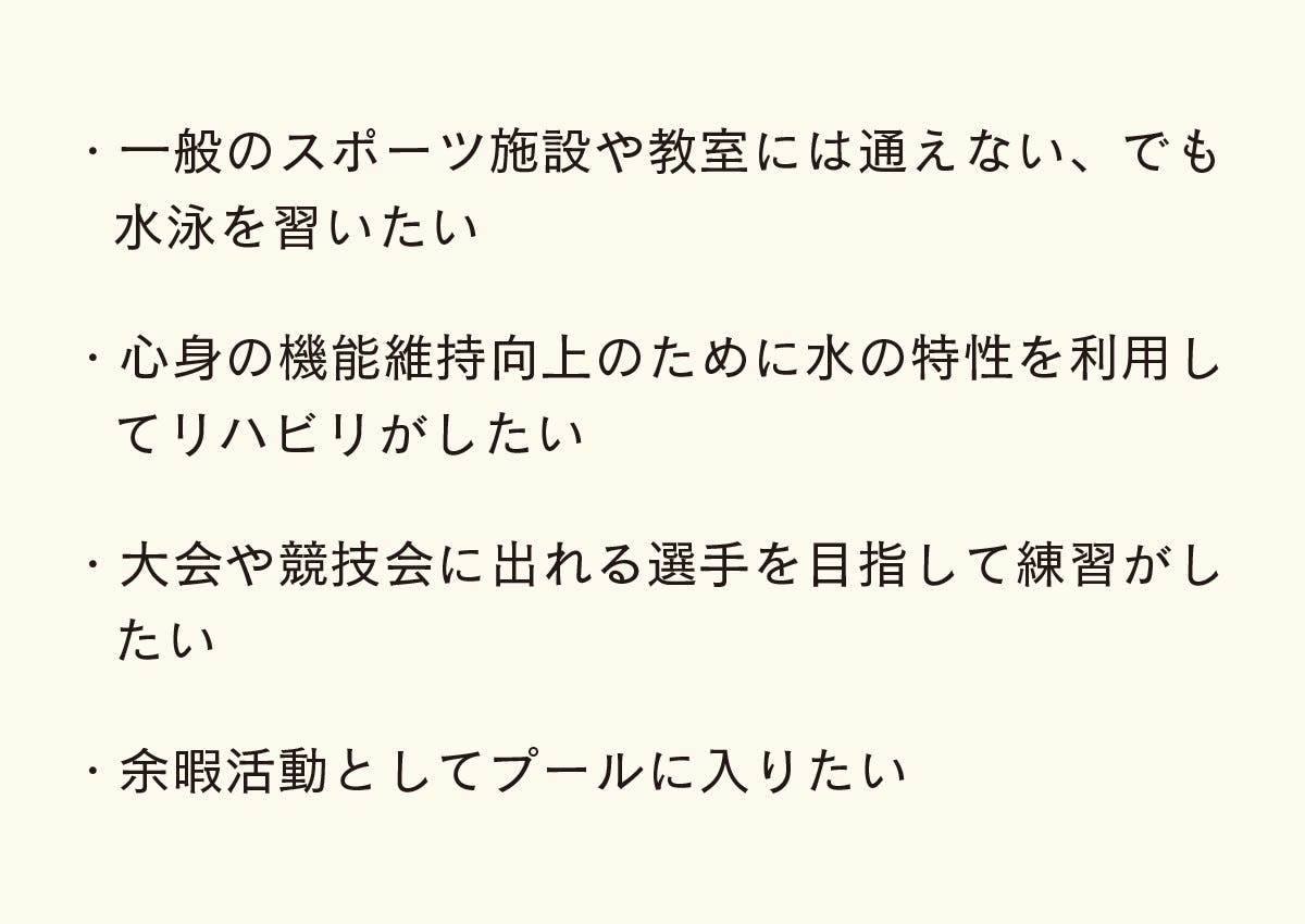 水の中が大好き。運動がしたい。丈夫な体をつくりたい。自信をつけたい。楽しみたい。