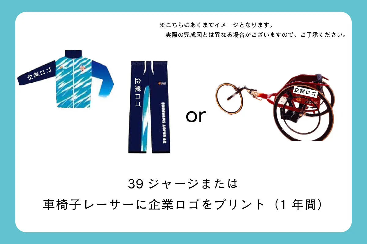 各種ウェア(39EnjoySwimmingチームTシャツ、39ジャージ)と車椅子レーサーに企業ロゴをプリント致します。(1年間)