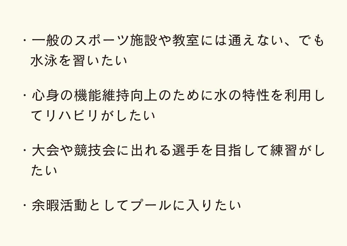 また、私たち夫婦は、元々水泳の実業団チームに所属しており、競泳経験もあったため、娘にも気軽に水泳を楽しませたいという想いもありました。