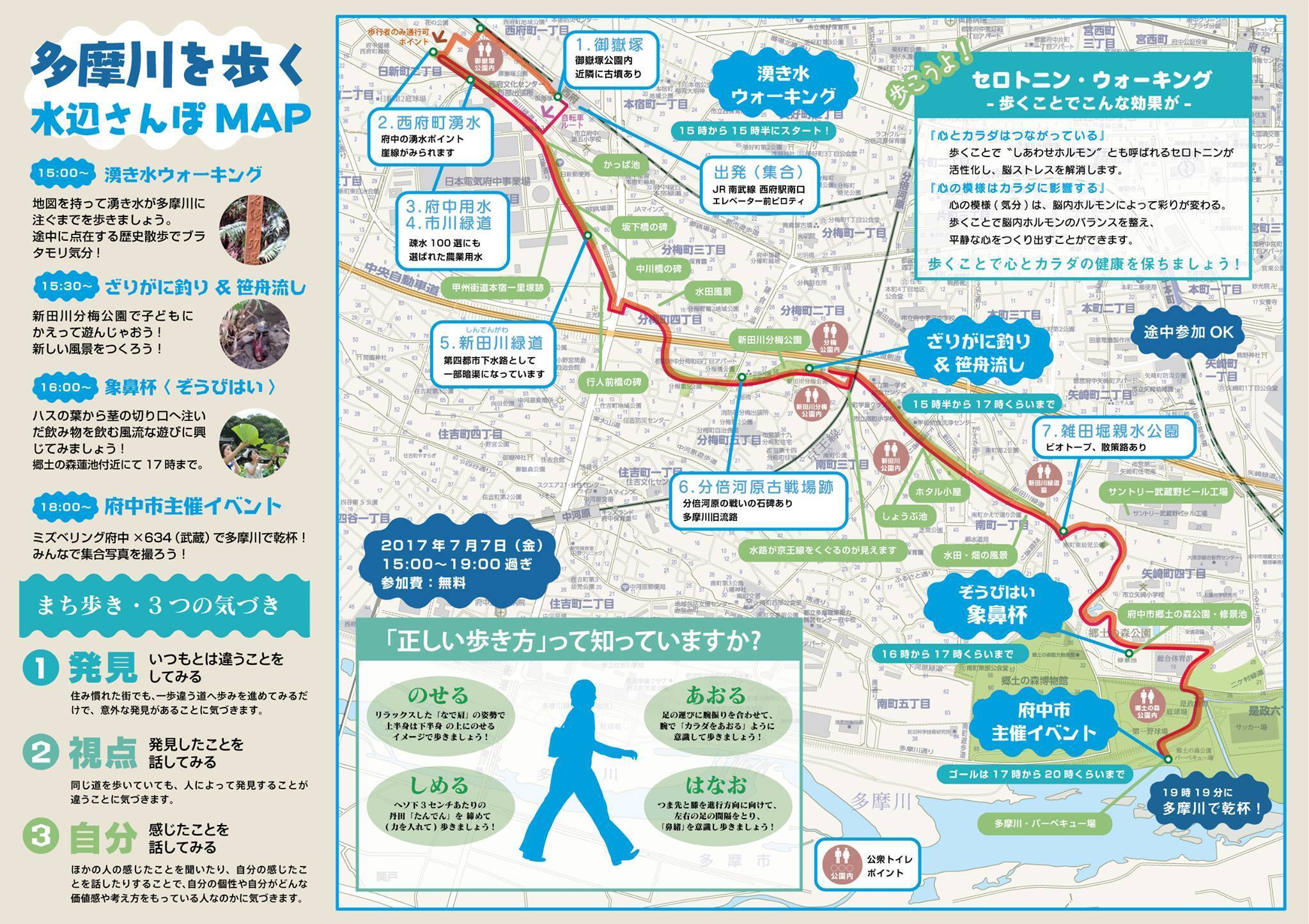 「一滴の湧水が多摩川まで注ぐ道のりを歩いてみよう」街歩きのルートを作り、ルート上にある自然や文化について、学んでいく「水辺さんぽ」だんだん進化し、今年は専門家と歩くとともに、府中の水辺の未来を語り合うワークショップを開催予定です。