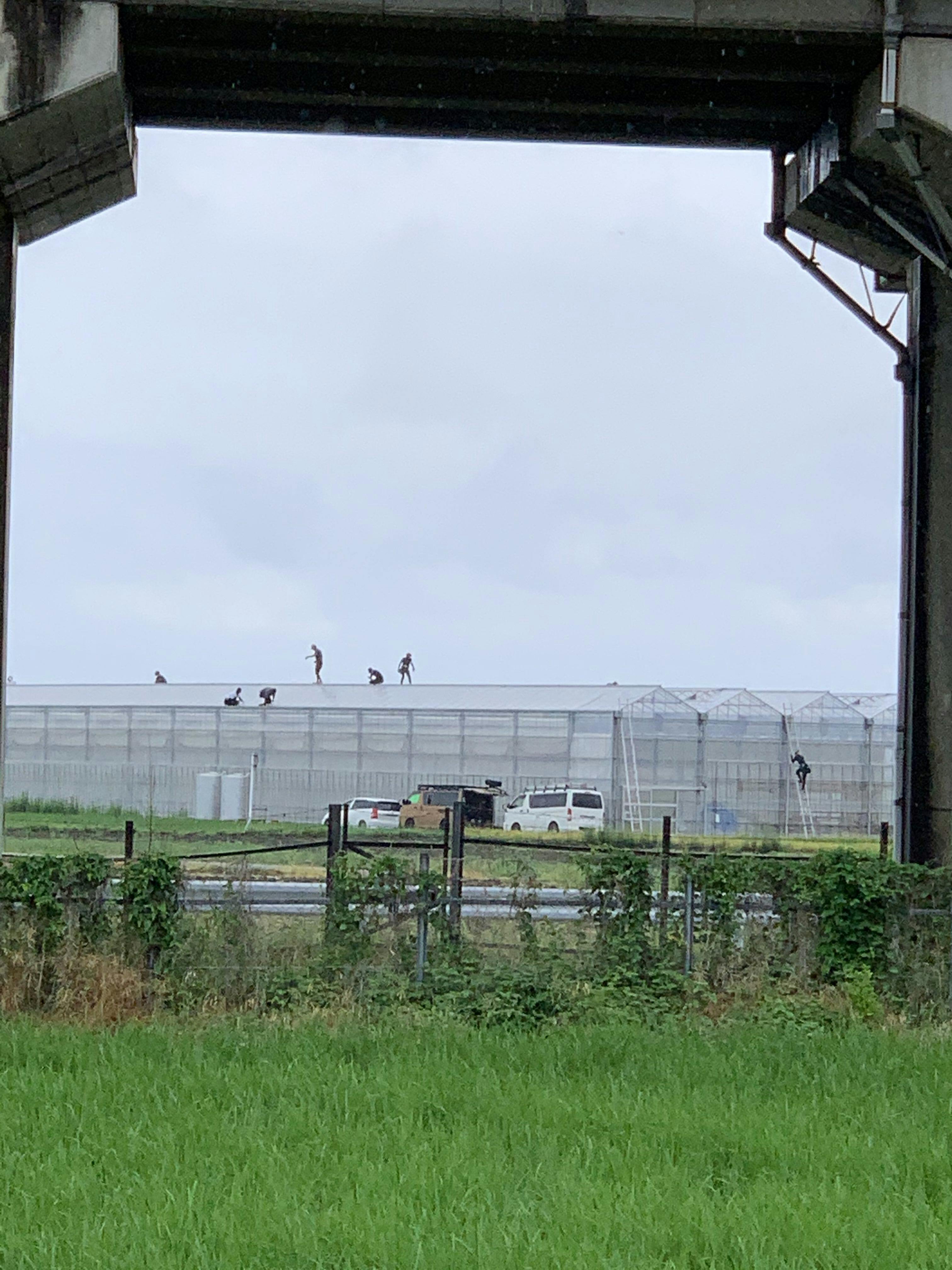 明日14日に苗が届く次世代型ビニールハウスの屋根の張り替え工事が、大人数の職人さんのおかげで今日一気に進みました。明日まで工事はかかりますが、ほぼ間にあいました!
