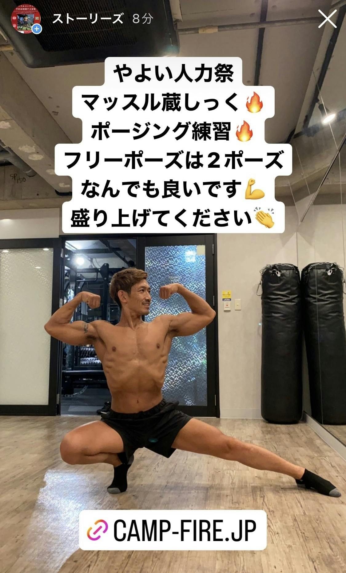 30代半ばから少しずつトレーニングを始めました。初めは自宅で腕立て伏せ、少しの時間で可能です。ちゃんと成果も出てきます。疲れますが、達成感があり毎日の励みになってきました。次に半田市のトレーニングジム!そしてベストボディジャパン に出場したいと思い!トレーニングジムに入会2015年ベストボディジャパン に初出場しました。結果は惨敗!ショックでした恥ずかしかったです。でも舞台では楽しかった。悔しい勝ちたいと思い2016年はトレーニング2017年ようやく予選突破できました。2018年には滋賀の大津大会マスターズで優勝でき!人生で1番拍手を頂きました。でも名古屋大会は3位止まり今でも優勝目指しています。その他にNPCJ、イオリンピアに出場しました。イオリンピアは多治見市で開催させています。個人で主催して多治見市を盛り上げようとする大会です。そこに出場させてもらい半田市で開催させようと決心が付きました。半田市を筋肉でもっともっと!筋肉付けて自信つけて健康に!学校では学べない事を感じて自分の筋肉で未来を切り拓け〜知多半島の筋肉出てこいや〜!