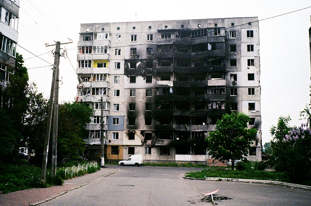 爆撃を受けだキーウの集合住宅