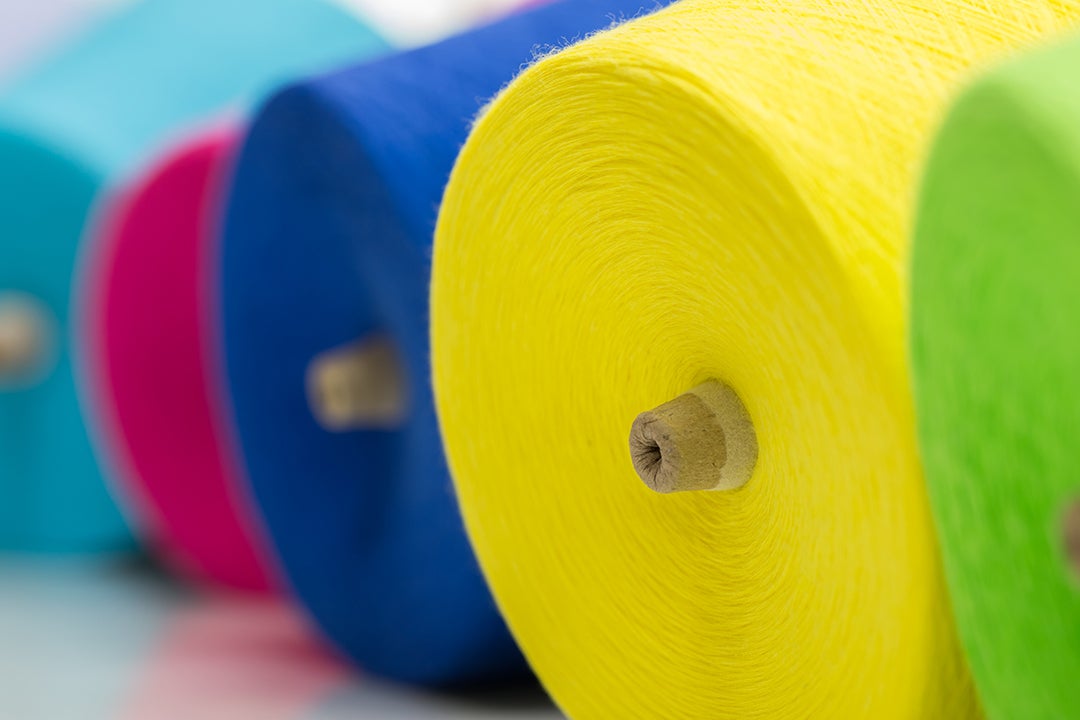 工場にはカラフルな糸が並ぶ