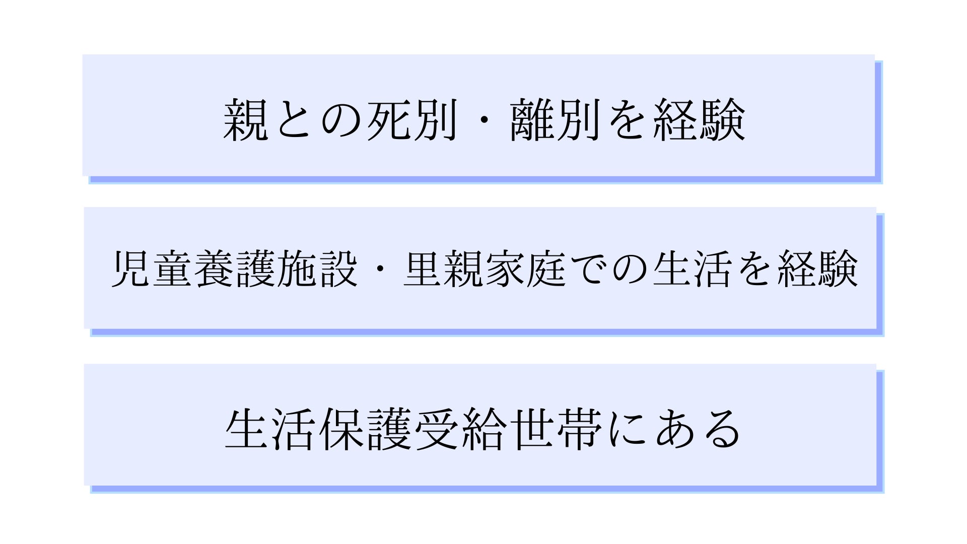 - 児童養護施設などの児童福祉施設に暮らしている。