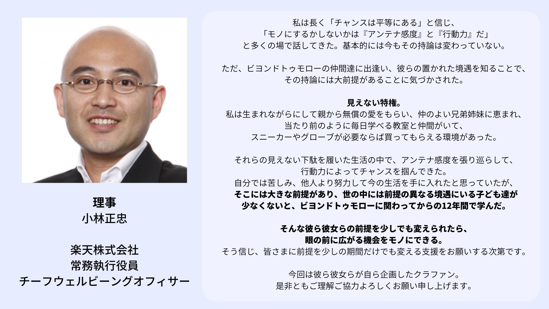 ビヨンドトゥモローは、被災した次世代を担う若者たちが、夢を諦めることなく将来を切り開いてほしい、という想いのもと、有志が資金を出し合い創設されました。