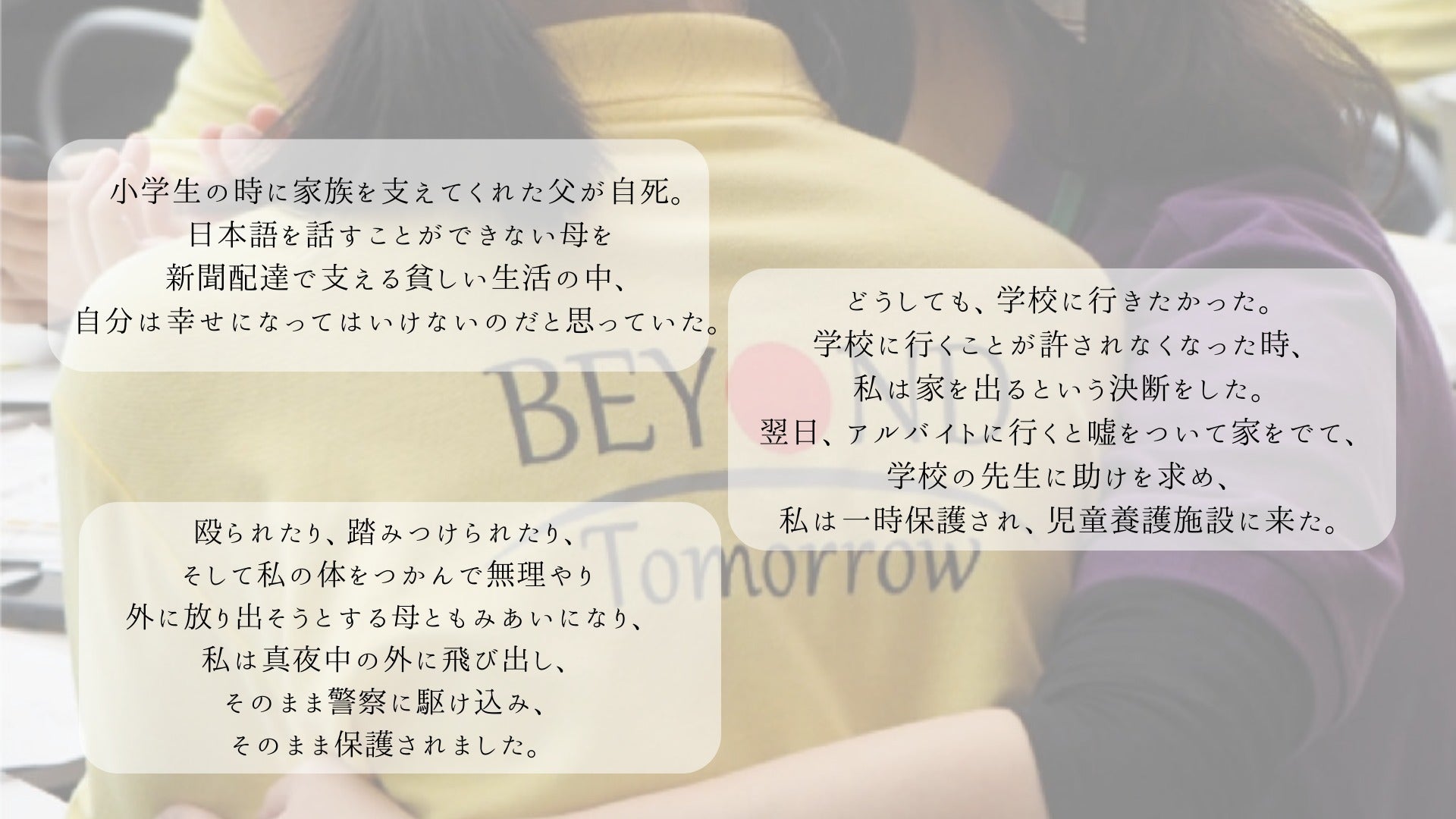 BEYOND Tomorrowは、親との離別など逆境を経験した高校生・大学生が、将来高い共感力を持って他者に寄り添い、社会のために尽力できる人材となる過程を応援しています。