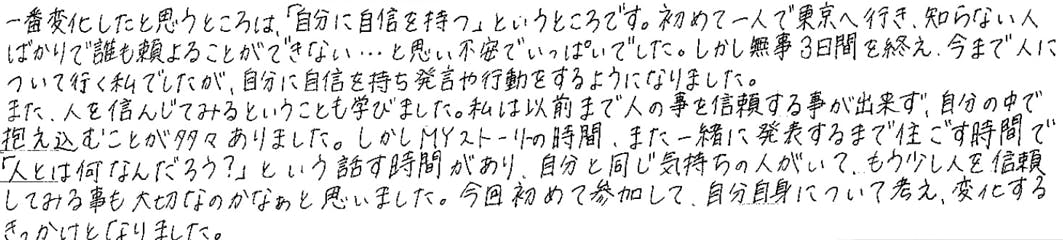 ※MYストーリー:体験共有のこと。互いのバッググラウンドや興味・関心などを共有することで心が軽くなり、相手を受け入れ、仲間同士の信頼を築いていく。