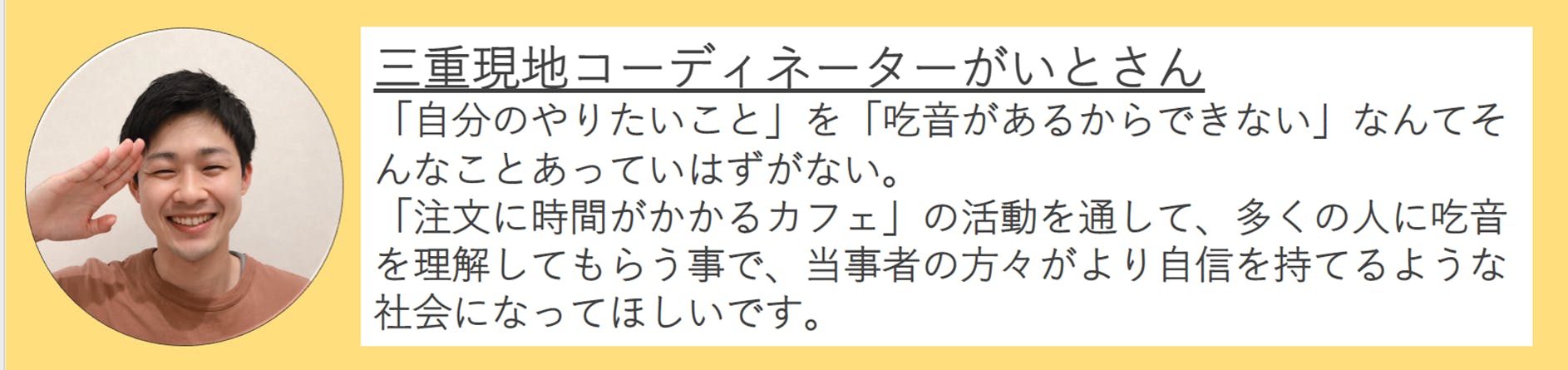 2人で奥村さんとがいとさんに提案したところ快く賛成してくださり、せっかくなら吃音と開催地三重県をコラボしようと