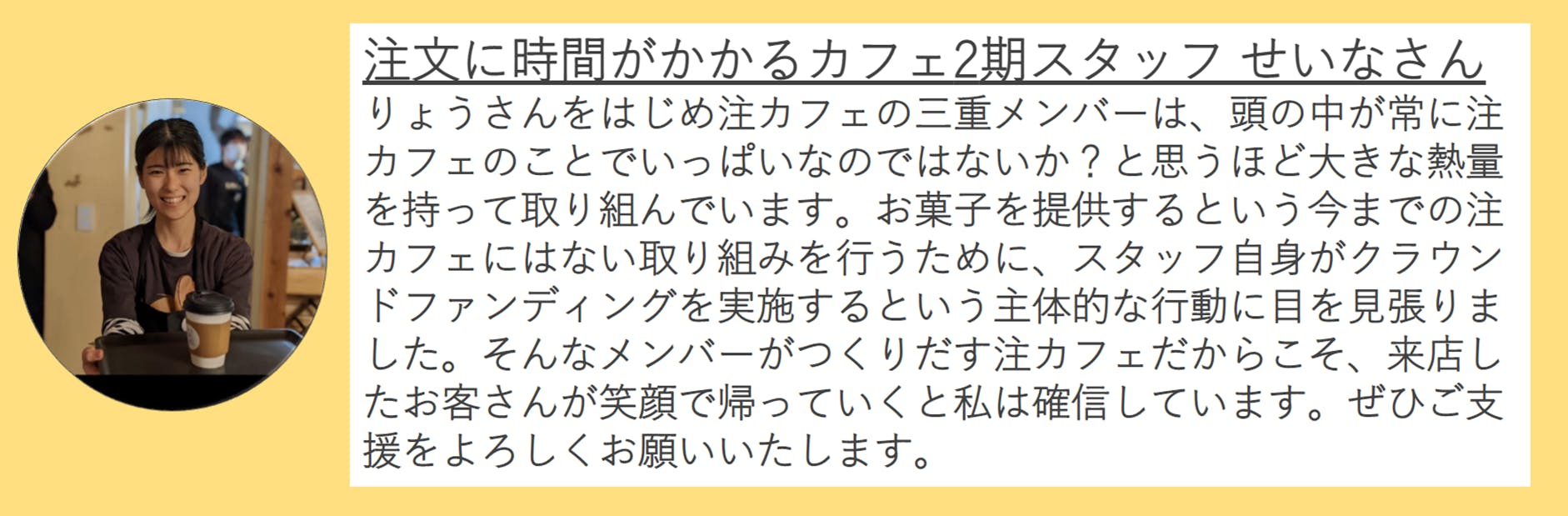 注文に時間がかかるカフェ@三重を開催するにあたり、スタッフとして接客の意識、お客様に来て良かったと思っていただけるような空間づくりを心掛けます。また、今回のクラウドファンディングを通して、皆様からのご支援を自信に変えて全力で自分らしさを発揮してまいります。