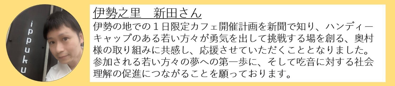 このような経験が出来る場をいただいたこと、来ていただいたお客様、応援してくださっている方に感謝して、温かいカフェになるよう一生懸命頑張ります!緊張でオドオドしてしまうかもしれませんが、見守ってくれると嬉しいです。