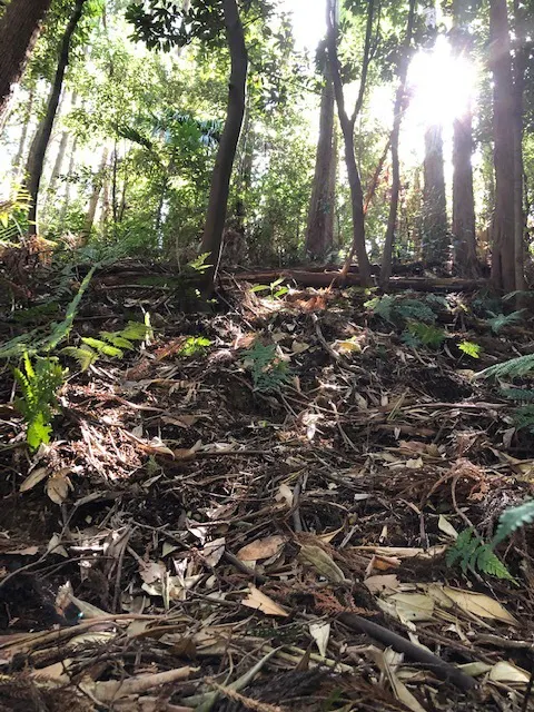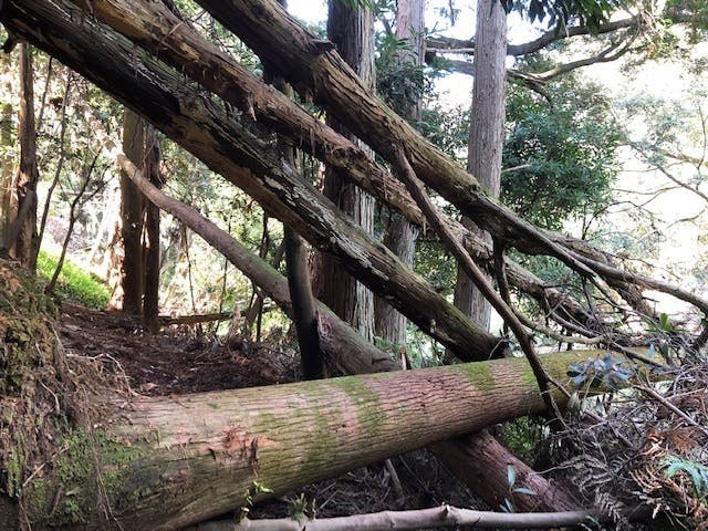 里山として管理されなくなった現在は、木々が日を遮り、日中でも薄暗い印象です。倒木や傾木が多く、人が立ち入れない場所が多くあります。かつて田んぼであった場所は、外来植物が覆い、沼地になっています。現在も豊富な湧水が湧き出ており、水が沼地の間を縦横無尽に流れています。田んぼ以外の場所は草が背丈ほど伸び、小さな植物に日が当たらなくなっています。里山であった頃に生息していた動植物も今は僅かにしか確認できません。森には進入路がありますが、狭く傾斜があるため重機が入ることができません。