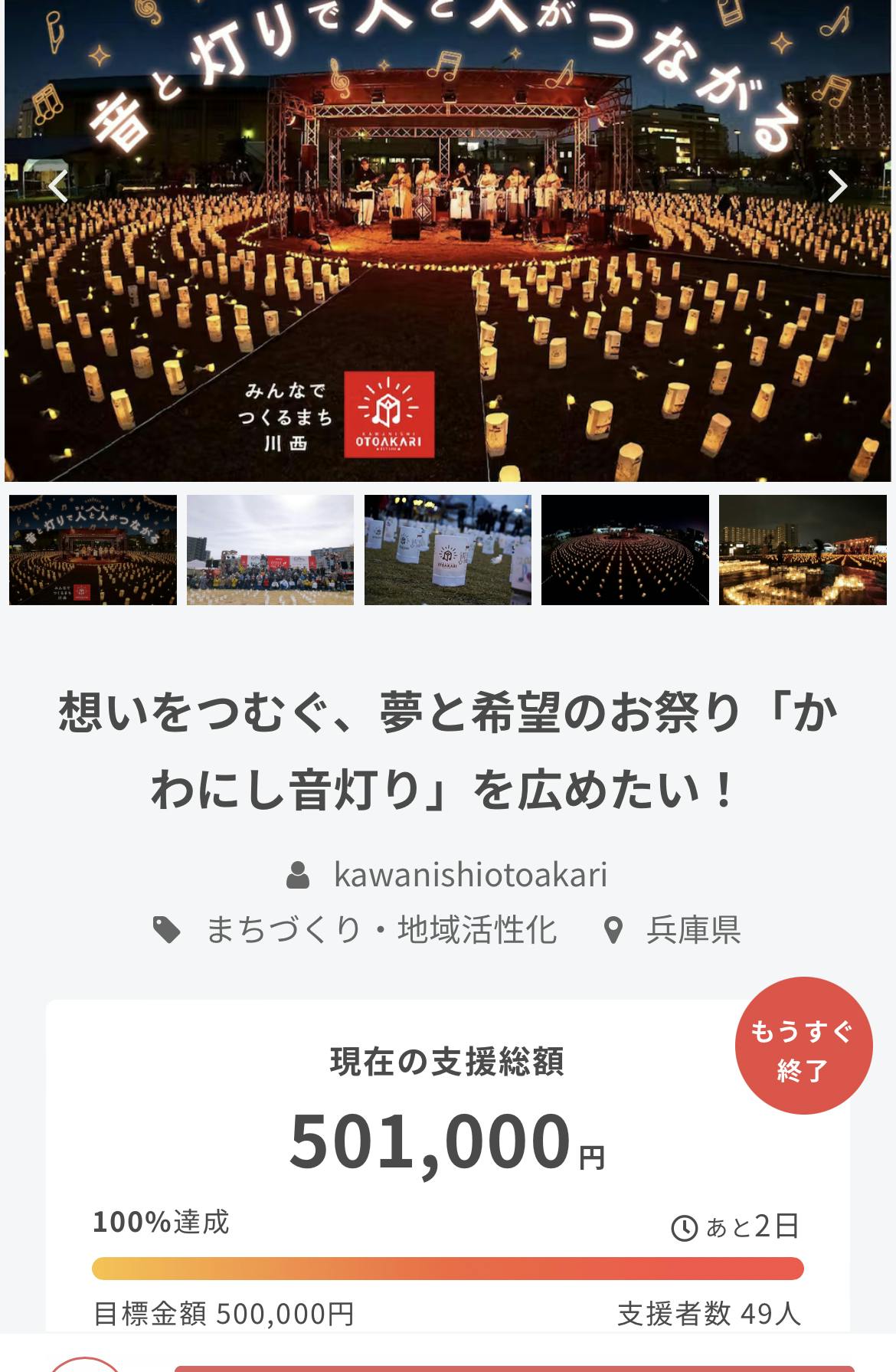 2022/09/28 15:58みなさんたくさんのご支援、応援ありがとうございます。クラファンも残り1日となりました。 みなさんのご支援と共に温かいお言葉をいただく中で、たくさんの人に支えられ、みなさんと創り上げているのだと、実行委員メンバー胸の熱くなる想いでいっぱいです。 私たちの先輩方が2011年にこのまつりをたちあげ、川西市民の人口、16万人を繋ぐと続けて来られた「かわにし音灯り」は、その灯りを消したくないと代を変え11年目の、12回になろうとしています。当時、赤ちゃんだった子どもたちは中学生になり、今やまつりを一緒に創る側に。 こうして、楽しみながら自分たちの町を盛り上げている大人たちの背中を見て子どもたちもこの町が好きになってくれたらいいな。大きくなって、川西市を出てしまってもまた戻って来たくなる町でありたいと願っています。 そんな一役をかわにし音灯りが担えればと、今年も、来年も再来年もずっと続くおまつりであるために、ご支援をムダにせぬように頑張っていきたいと思います。 残り数時間も諦めること無く走ります。どうぞ、よろしくお願いします。 もっと見る