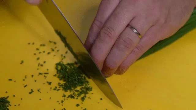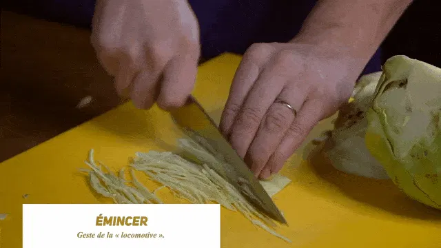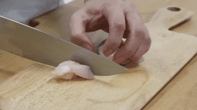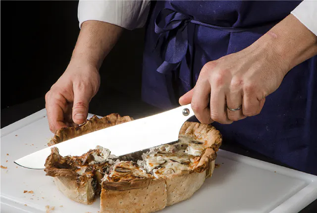 このシェフナイフは、大きめの肉や魚のカットだけでなく、野菜のスライス、千切り、など、さまざまな目的に使用できます。剛性の高い刃で、振り戻しの力を使いやすいようにブレードがカーブしています。シェフが「couteau de tour=まわる包丁」とも呼ぶ包丁です。