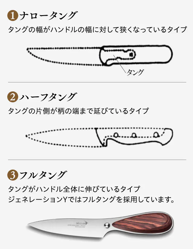 ハンドル材を取り付ける箇所をタングといいます。タングにはいくつかの種類があります。
