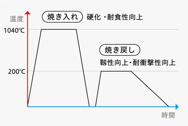 硬化させただけだと、割れや刃こぼれしやすいため、粘りをだすための焼き戻しと呼ばれる熱処理を行います。焼き戻しは、200℃で加熱し、その後、じっくりと冷却します。