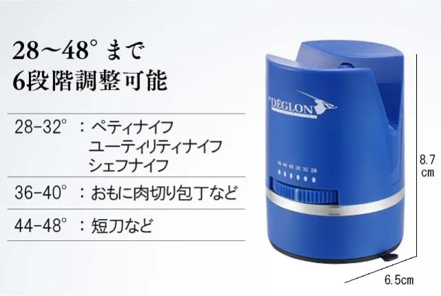 研ぐ角度が6段階調整可能なデグロン社専用のコンパクトな研ぎ器です。