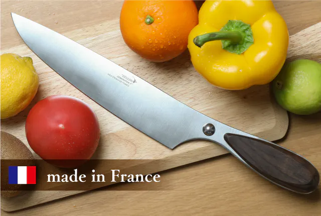 ゾーリンゲンとならぶ刃物の生産地であるティエールにて設計から製造まで行われている、メイド・イン・フランスの包丁は、『瞬間の切れ味』だけでなく、『継続する切れ味』を実現した商品です。