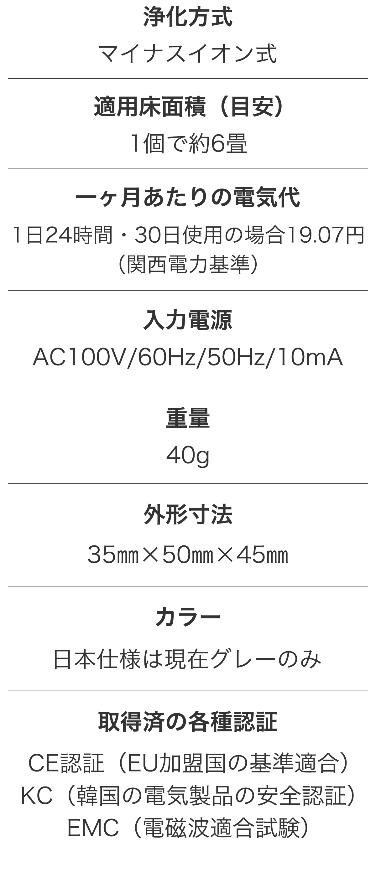 A:製品1個の消費電力は1W。30日ご使用いただいた場合、約19.07円(関西電力基準 1W/1日24時間使用の場合)です。一般家庭で5台使用した場合でも、一ヶ月あたりの電気代は95.35円。低い消費電力量も、イオニスプラグの大きなメリットです。
