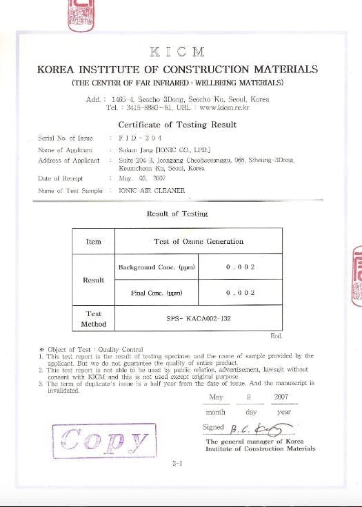 イオニスプラグはそのオゾンが一切発生しません。添付の韓国の公認試験所からの試験からも一切オゾンが検出されておりませんので安心してご家庭で使って頂いてもいいです。特に老人ホーム、保育園、病院などでの使用に適しております。オゾン発生はないままマイナスイオンだけ約2000万個生成する能力の持ち主です。上記のGIFファイルでの市販のマイナスイオン測定器をあてるとマイナスイオンが測定されその測れる規定値を超え”1”になることがわかります。