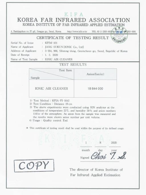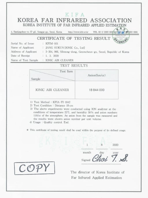 添付は韓国政府公認機関からのイオニスプラグのマイナスイオン発生量を実験した成績書です。