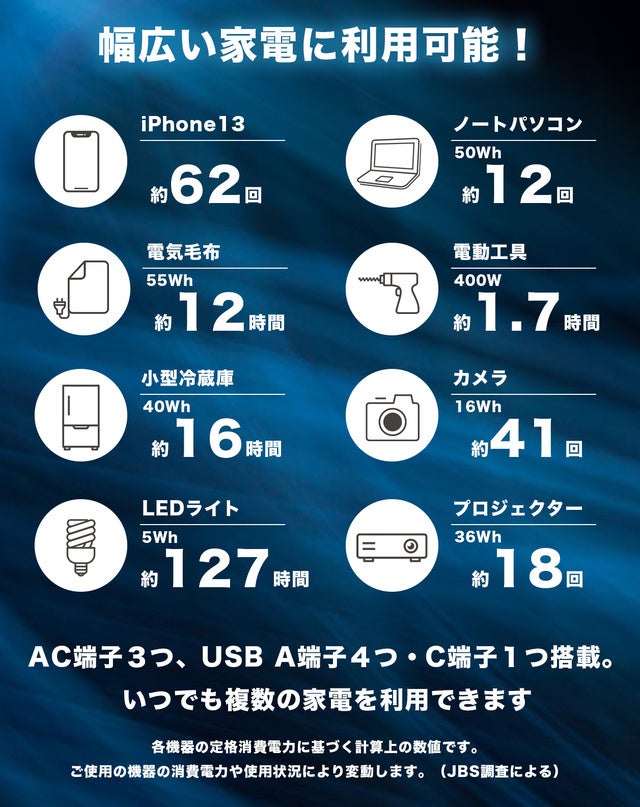 806Wh容量の場合、概ね以下の時間、使用する事ができます。