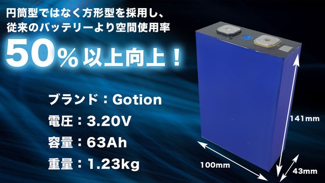 従来の丸柱型リン酸鉄バッテリーより空間使用率を50%以上向上させ、小型化を実現しています。