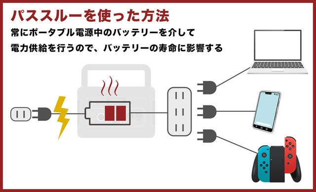 災害や電力ひっ迫により停電が発生した場合、コンセントの電源からバッテリー電源へ瞬時に切り替わる機能です。本来はサーバーやコンピューターが停電による電源トラブルが発生した際に、正常なシャットダウン作業ができるためのバックアップ装置です。最近ではUPS機能を搭載したポータブル電源増えてきていますが、大半が「パススルー」という充電しながら同時に放電をするという機能を利用しています。この方式はバッテリーを常にフル稼働させている状態となるため、バッテリーの寿命を縮め、安全面からも推奨できる方式ではありません。