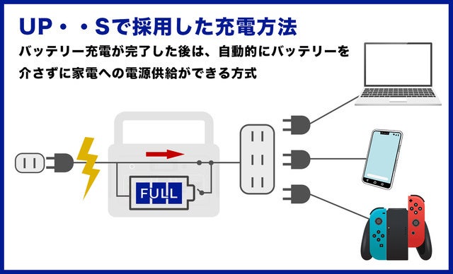 ポータブル電源は常に使用しないことが多いため、災害や停電などの緊急時に使えないことがありました。そこでRS800Wでは愛称であるUP‥Sの由来となったUPSを搭載しました。